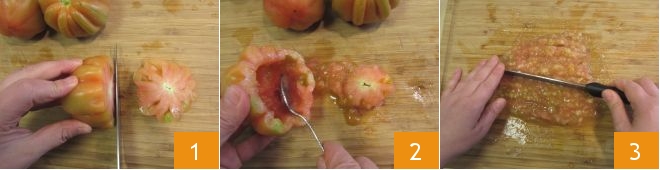 To prepare the meat-stuffed tomatoes, first wash the tomatoes, cut off the top cap to a thickness of about 3/4 in 1 and set them aside. Scoop out the inside of the tomatoes with a teaspoon 2 and finely chop the extracted pulp 3.