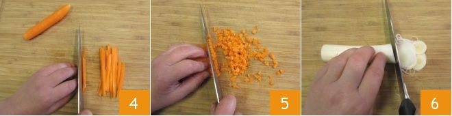 Peel the carrots and cut them first into strips 4 and then into very small dice 5. Finally remove the ends of the leek and slice it into thin rounds 6.