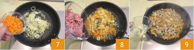 Now take a nonstick skillet, pour about 2 tbsp of oil taken from the total amount and add the leek and carrots 7. Sauté over medium-high heat for about 4–5 minutes, then add the ground meat 8 and brown it for about 3 minutes. At this point deglaze with the white wine 9 and let it evaporate completely,