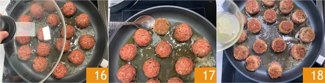 Brown the meatballs for 5 minutes over medium-high heat, covering with a lid. At this point, turn the meatballs with a spoon or spatula 17; if they are not yet golden on that side, continue cooking for another 2 minutes. After turning them, deglaze with lemon juice 18.