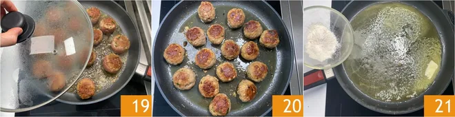 Cover again with the lid 19 and continue cooking for another 8 minutes. Once cooked 20, remove the meatballs from the pan and keep them warm. In the same pan, melt the butter for the sauce 21.
