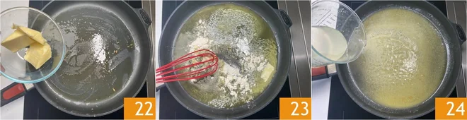 Once melted, add the flour 22 and stir with a whisk to avoid lumps 23. Now add the lemon juice and hot vegetable broth 34.