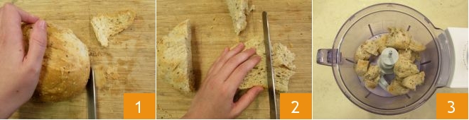 To prepare the pear and Goat Blue meatballs, start by taking the cereal loaf: remove the crust (40 g of crust will be needed later for breading, so keep it aside) 1; cut the crumb into pieces 2 and place it in a food processor 3