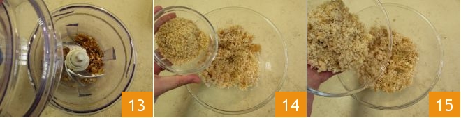Also chop the walnut kernels using the food processor but with few blade strokes to avoid releasing too much oil 13, add them to the rest of the ingredients 14, also pour in the previously ground bread crumbs 15