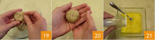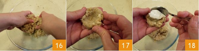 Knead everything by hand to obtain a fairly compact mixture 16. Take a small portion of the dough, round it between the palms of your hands, then press it in the center to create a small cavity 17 to fill with a teaspoon of Goat Blue cheese 18.