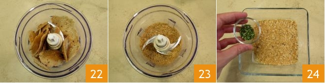 Still in the food processor, place 40 g of the reserved bread crust 22, blend it finely 23, then transfer it into a bowl and season with chopped rosemary 34