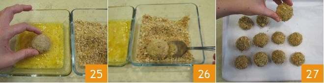Dip each meatball in the beaten eggs 25 and then in the rosemary breadcrumbs 26. As they are ready, place the meatballs on the tray 27.