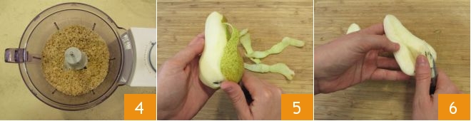 grind it into a fine powder 4. Then move on to cleaning the Abate pears: peel them 5, then cut them in half and remove the seeds and core 6