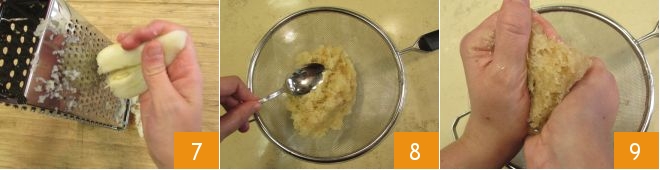 Grate the pears with a fine grater 7 and collect the pulp in a sieve. Press with the back of a spoon to remove most of the water 8, then further squeeze the pulp with your hands 9 until you get a dry ball.