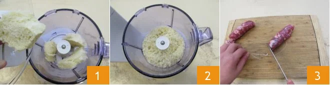 To prepare meatballs with tomato sauce, start with the meat mixture: cut stale bread into pieces and place it in a mixer with blades 1 and pulse until crumbly 2. Set the crumbs aside and remove the twine from the sausages,