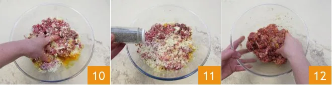 and knead everything with your hands 10, adding salt and pepper 11 and mix until you have obtained a homogeneous mixture 12.