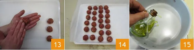 Use this mixture to form little balls weighing 7 oz each 13, taking a piece of the mixture and shaping it with both hands: with our quantities, you will obtain 34 meatballs 14. As soon as all the meatballs are ready, heat some oil in a non-stick pan