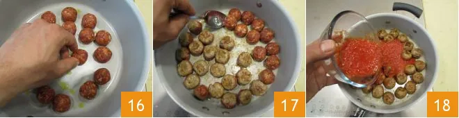 and when the oil is hot, place the meatballs in the pan 16, cooking them on both sides for a couple of minutes 17. Pour in tomato puree18