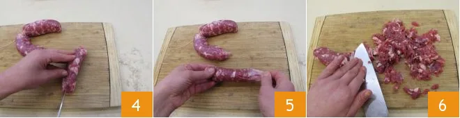 cut them gently lengthways 4 and finally remove the casing 5. Squeeze the meat out with a knife blade or a fork 6,