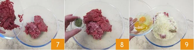 then place it in a bowl together with the ground meat 7. Add oregano, a pinch of grated nutmeg, and chopped parsley 8. Finally, add grated Parmesan cheese and the breadcrumbs you made as well as an egg