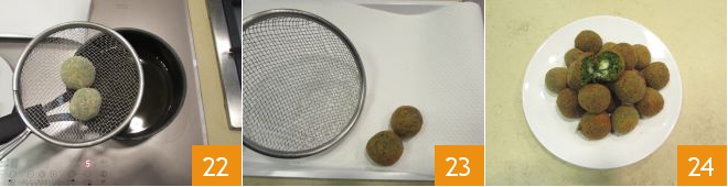 Close the meatball by rolling it between your hands 19. Prepare the breading: in a small bowl, beat the eggs with a pinch of salt and pour the breadcrumbs into another. Meanwhile, heat the oil for frying in a pot to a temperature of 330°F. Dip the meatballs first in the beaten egg 20 and then in the breadcrumbs 21.