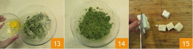 Incorporate the egg 13 and mix again to create a homogeneous mixture 14. In the meantime, cut the Taleggio into cubes 15.
