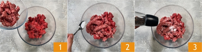 To prepare the meatloaf in a pan, combine ground beef and sausage in a bowl 1, then season with salt 2 and pepper 3.