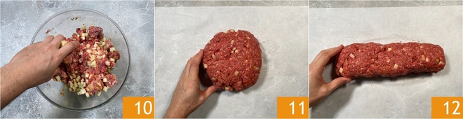 Continue to knead by hand in the bowl until you get a homogeneous mixture 10; this step is crucial for good cooking results 11. Place the mixture on a sheet of parchment paper 11 and shape a meatloaf slightly shorter than the diameter of your pan 12.