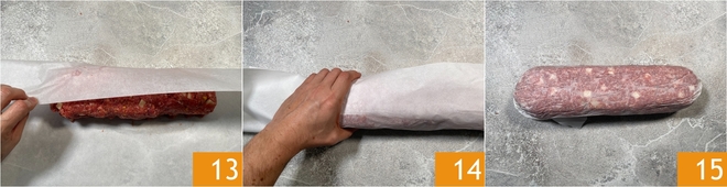 Wrap the meatloaf in the parchment paper 13, tighten well 14 and seal by folding the ends underneath 15. Let the meatloaf firm up in the refrigerator for 10 minutes.