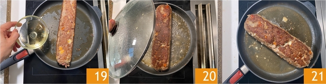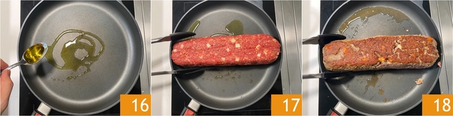 After the chilling time, heat the oil in a large pan 16, then carefully place the meatloaf and sear it on one side without touching it 17. With the help of tongs, turn the meatloaf to sear on the other sides 18; it will take a total of 12 to 18 minutes.