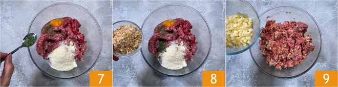 Flavor with dried chives 7 and finally add the rustic breadcrumbs 8. Mix with your hands to combine the ingredients, then add the cubed Gruyère 9.