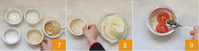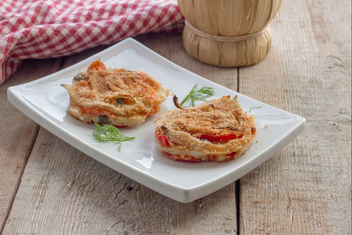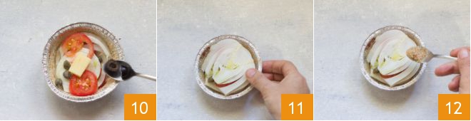 Now sprinkle the entire inner surface with breadcrumbs 7. At this point, you can fill your molds: place a layer of fennel at the bottom 8, then one of cherry tomatoes and flavor with capers (previously desalinated) 9,