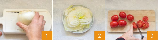 To make the Mediterranean fennel cakes, first thinly slice the fennel using a mandolin slicer (1-2). Wash the cherry tomatoes and cut them into thin slices 3.