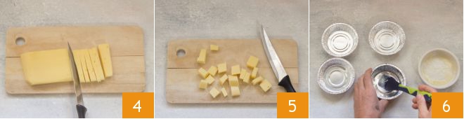 Cut the cheese first into strips 4 and then into cubes 5. Now take some aluminum molds, 4 inches in diameter and with a height of 1.25 inches. Melt the butter and butter the bottom and sides 6 using a pastry brush.