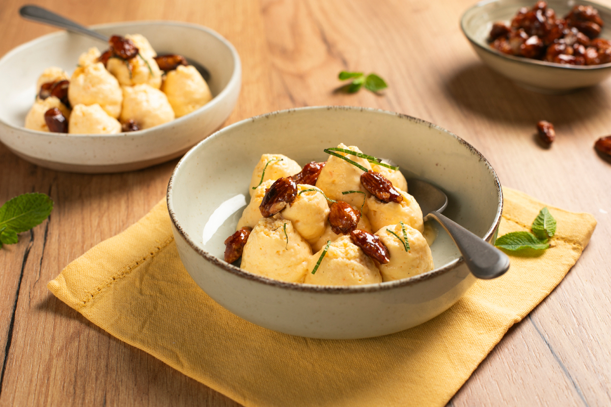If you are looking for a dessert that wins over with lightness, elegance, and a truly summery taste, the melon namelaka is the perfect choice. A creamy, fresh, and surprising spoon dessert that enhances all the fragrance and taste of melon, the symbol fruit of the beautiful season. It's simple to prepare, but the final result is like from a pastry shop: a velvety cream that combines white chocolate, cream, and melon for a perfect balance between sweetness and freshness. To top it all off, crispy praline almonds and fresh mint add an irresistible aromatic touch.