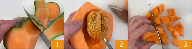 To prepare the melon namelaka, first clean the melon: cut off the rind 1 and remove the central seeds 2. Cut the flesh into cubes 3.