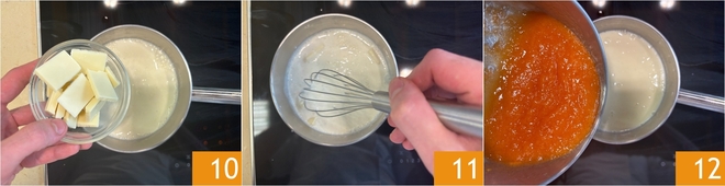 Once hot, turn off the heat and add the white chocolate pieces 10. Stir 11 and also incorporate the melon pulp 12.