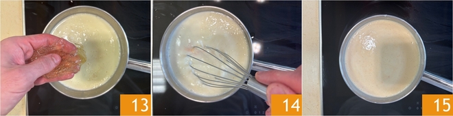 Finally, add the drained and squeezed gelatin 13. Stir with the whisk 14 until completely dissolved 15.