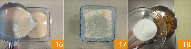 Transfer the cream to a shallow bowl 16 and let it cool, then cover with cling film in contact 17. Place in the fridge for 6 hours. In the meantime, prepare the praline almonds: take a pan, preferably steel, and pour in the sugar and almonds 18.
