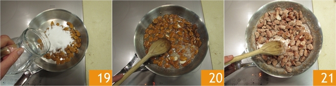 Cover with water 19, turn on the heat to medium-low, and start stirring 20: at first, the water and sugar mixture will be very liquid, then it will start to boil and finally crystallize forming a coating around the almonds 21.