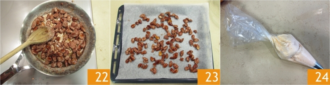 At this point, slightly lower the flame and continue stirring until the sugar starts to caramelize and take on a dark amber color 22. Pour the almonds onto a baking sheet lined with parchment paper 23 and let them cool. After the resting hours in the fridge, retrieve the cream and transfer it to a piping bag with a smooth nozzle 34.