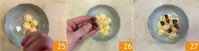 Distribute dollops of cream on the serving plate 25 and garnish with praline almonds 26 and julienne mint. Your melon namelaka is ready to be enjoyed 27!