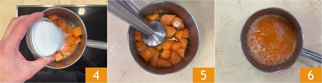 Transfer the melon into a saucepan and add the sugar 4, then cook over medium heat for about 10 minutes. After this time, blend the cooked pulp with an immersion blender 5 to obtain a smooth sauce 6.