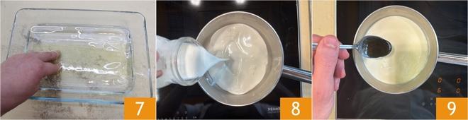 Soak the gelatin sheets in cold water for 10 minutes 7. In a saucepan, heat the cream 8 with the addition of vanilla extract 9.