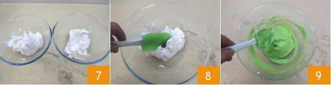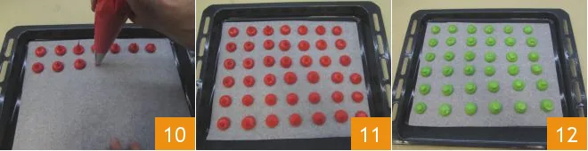Then divide the obtained mixture equally into two small bowls 7. In one, add 1 g of green food coloring 8: mix well with a spatula to make the color uniform 9. Repeat the operation with the red food coloring.