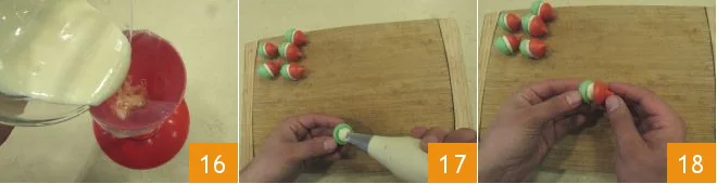 Then pour the white chocolate cream into a piping bag 16. Take a green meringue and fill it with cream on the flat side 17, then place a red meringue on top 18. Repeat the operation for the 30 meringues and enjoy them for a delicious Liberation Day!