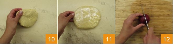 Transfer it to a work surface, compact it 10, and wrap it in plastic wrap 11. Let it rest in the refrigerator for about an hour. In the meantime, wash the plums and cut them in half 12.