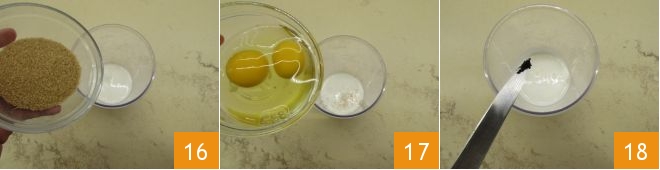 Add the brown sugar 16, eggs 17, and the seeds from half a vanilla pod 18.