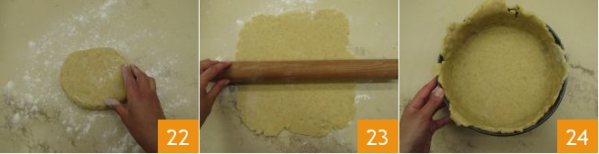 At this point, take the pastry 22 and roll it out to a thickness of about 1/4 inch 23. Then, transfer it to a 9-inch springform pan, pressing gently to ensure it adheres to the edges 34.