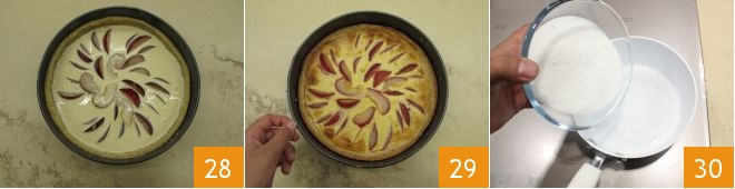 Using a small knife, trim the excess dough to create a border of about 1 1/4 inches 25. Then, arrange the plum wedges in a circular pattern on the base 26 and pour the milk, eggs, and cream mixture over them 27.