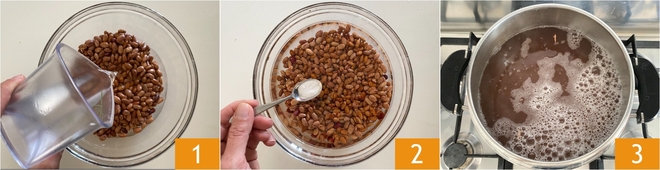 To prepare Mexican beans, first put the dried beans in a bowl with cold water 1, add a pinch of baking soda 2, and let them soak overnight. The next day, pour the drained beans into a pot of boiling water and, when it returns to a boil, drain them again; this way they will be more digestible.