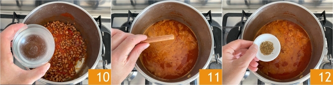Cover the beans with water 10, then add the cinnamon stick 11 and cumin 12.