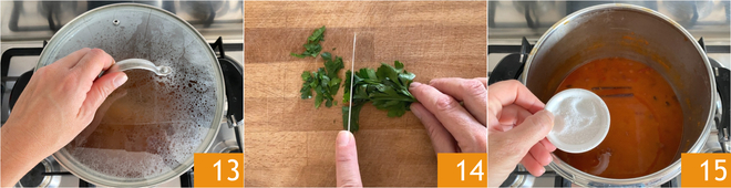 Cook with the lid on for about 3 hours on low heat, stirring occasionally and adding a little water if necessary 13. Meanwhile, chop the parsley 14. After the cooking time, season with salt 15.