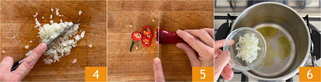 Peel and finely chop the onion 4, then slice the chili pepper into rings 5. In the same pot where you blanched the beans, add the onion with a generous drizzle of oil and let it fry gently 6.