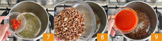 Once the onion has wilted, add the chili pepper 7 and let it flavor. At this point add the beans 8 and sauté them for a few minutes on high heat, then lower the heat and add the tomato sauce 9.